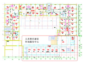 基于建筑群的现有空间结构和专业工作的需要,本着“安全、简洁、自然、安静、舒适”的原则,儿童教育康复中心的康复训练服务区都设在了建筑群的首层(地面层),儿童教育康复咨询服务中心设在了二层的区域。